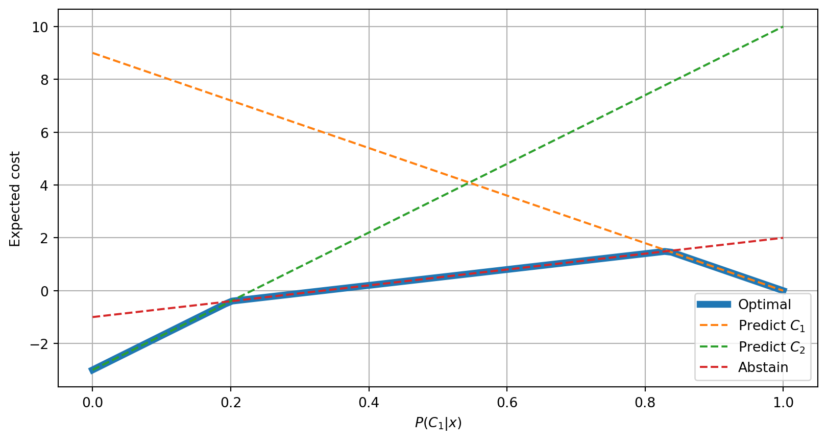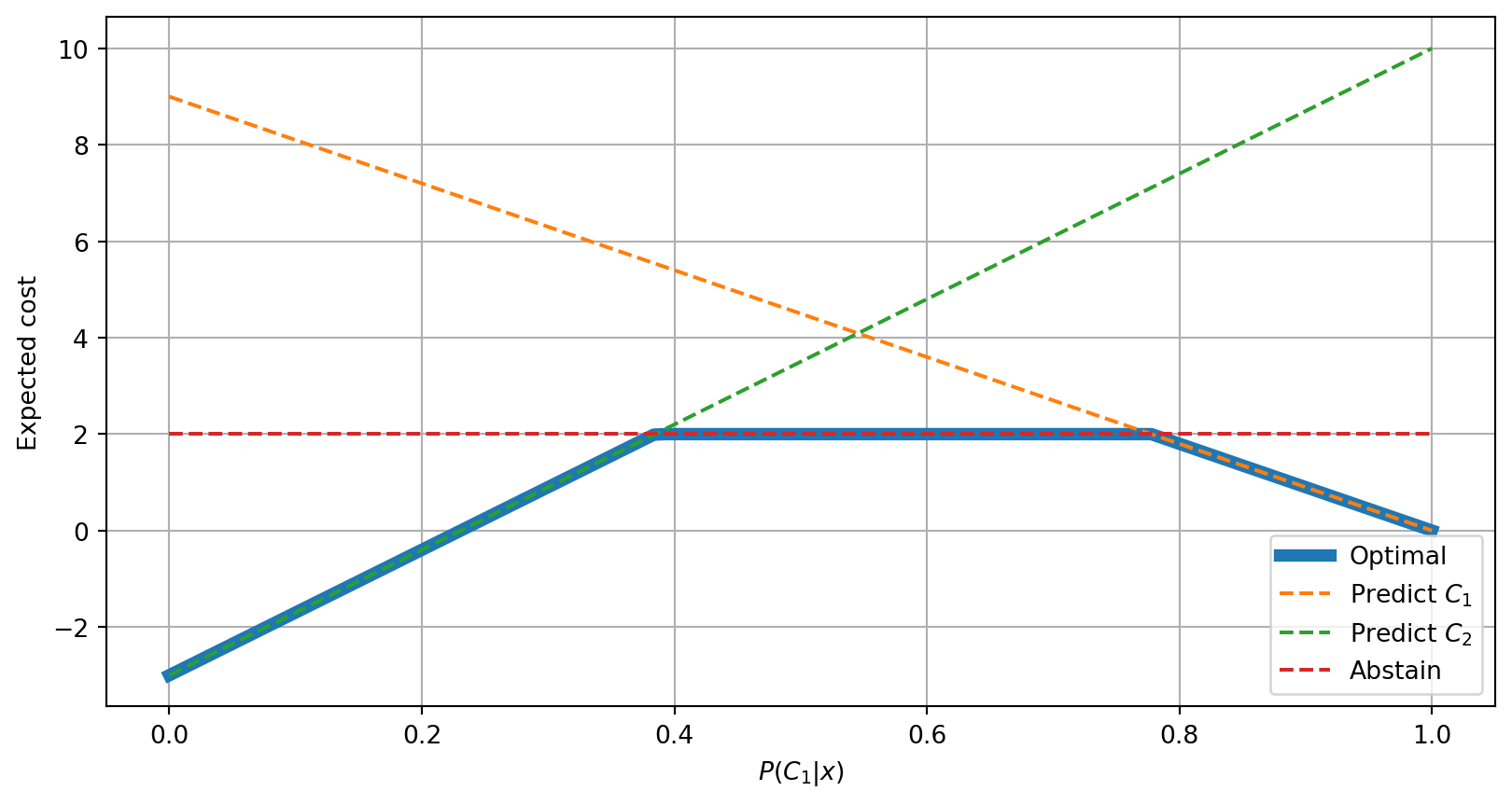 where we have highlighted the minimum cost among the possible predictions. In this particular case the optimal prediction changes when the probability of the true class is higher or lower than \(0.5\), with the same expected cost for both classes at \(0.5\).