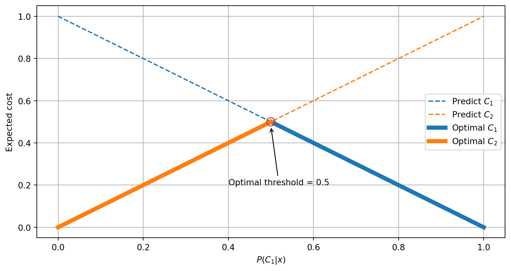 In the binary classification setting we can derive the optimal threshold \(t^*\) of selecting class one if \(p \ge t^*\).