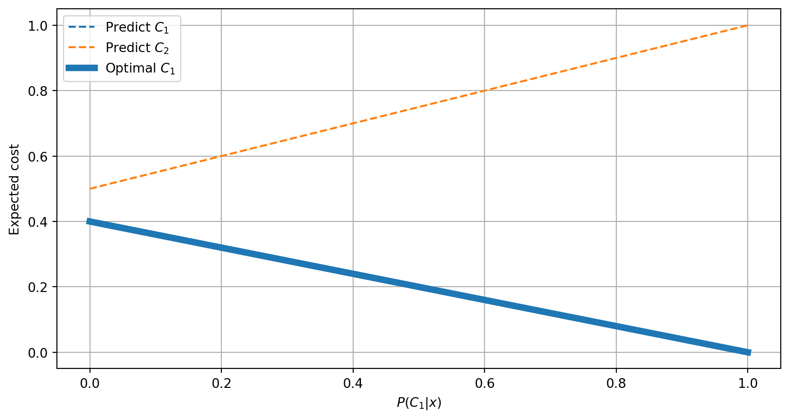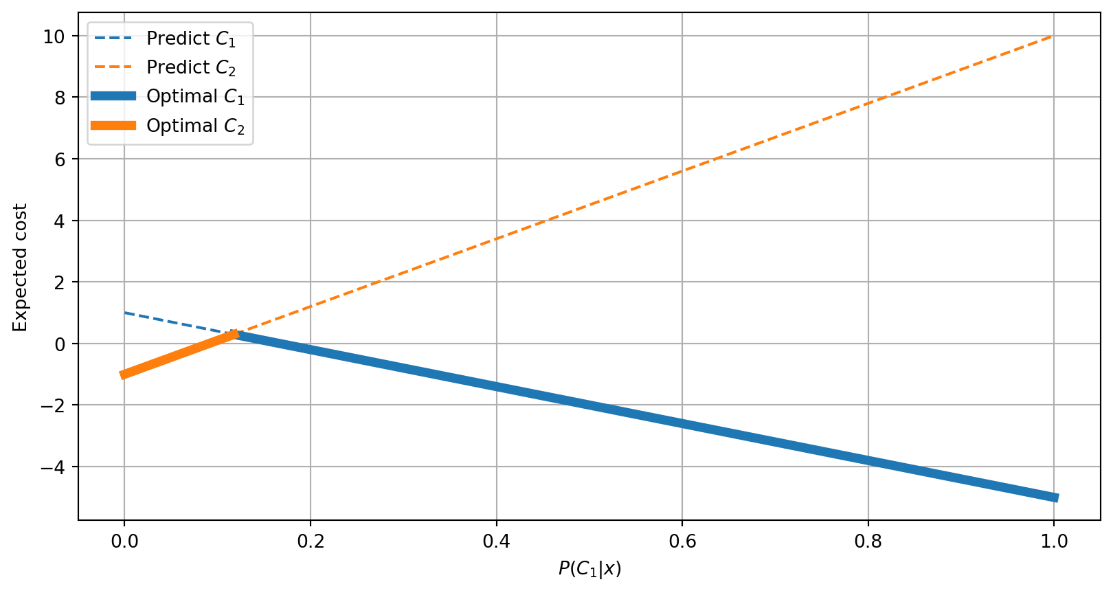 In the binary case we want to predict class \(C_1\) if and only if predicting class \(C_1\) has a lower expected cost than predicting class \(C_2\)
