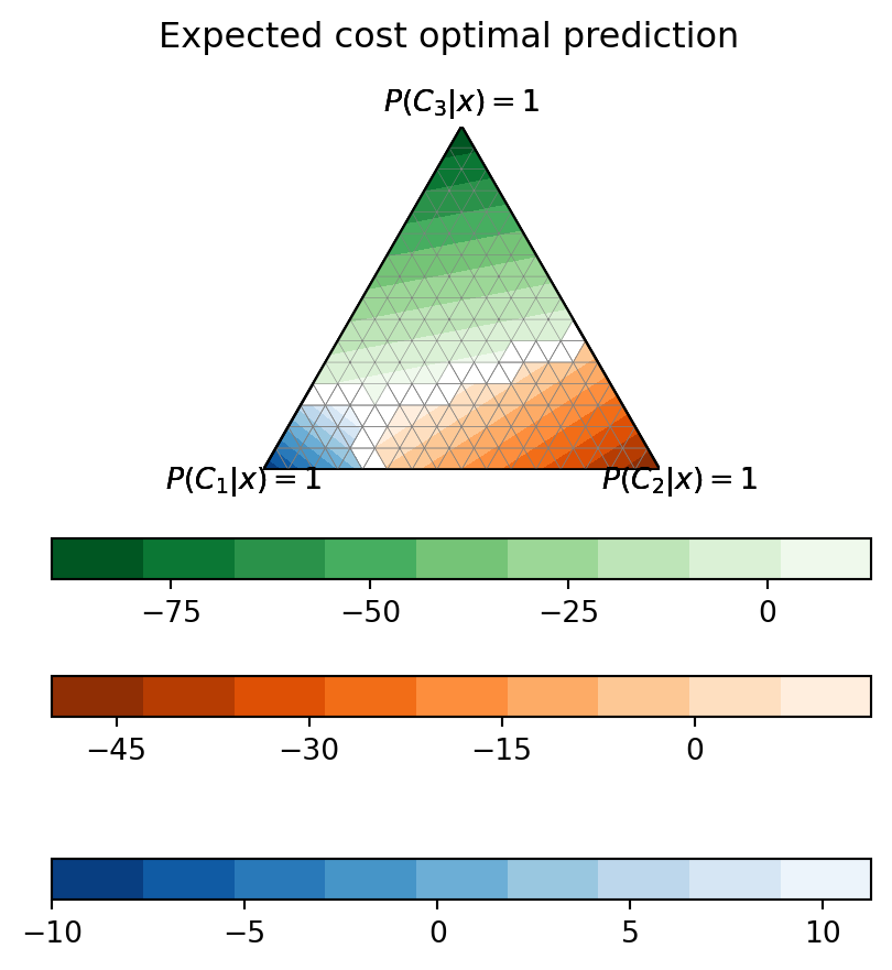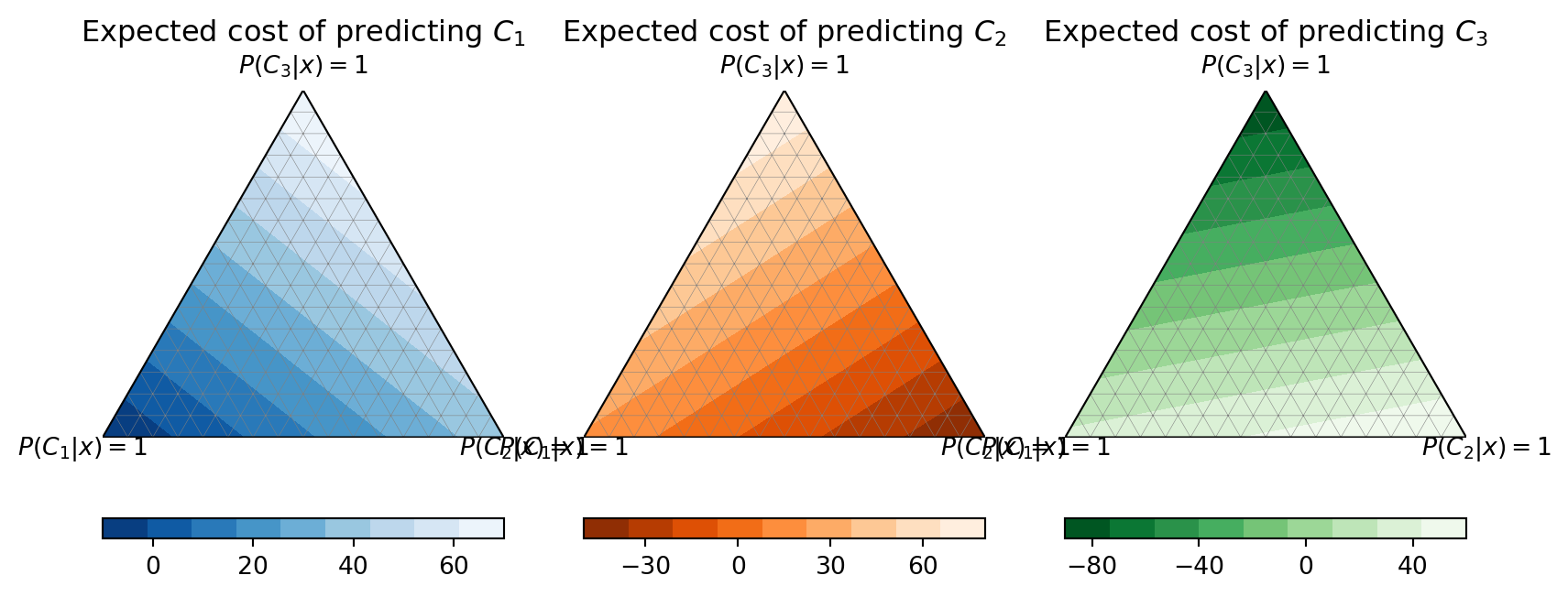 In order to exemplify the process of making an optimal decision in more with more than two classes we can look at the ternary case, which naturally extends to more classes. Given the following cost matrix