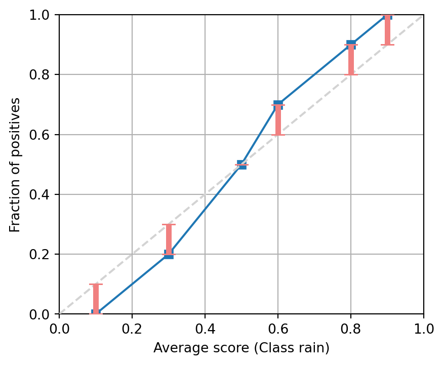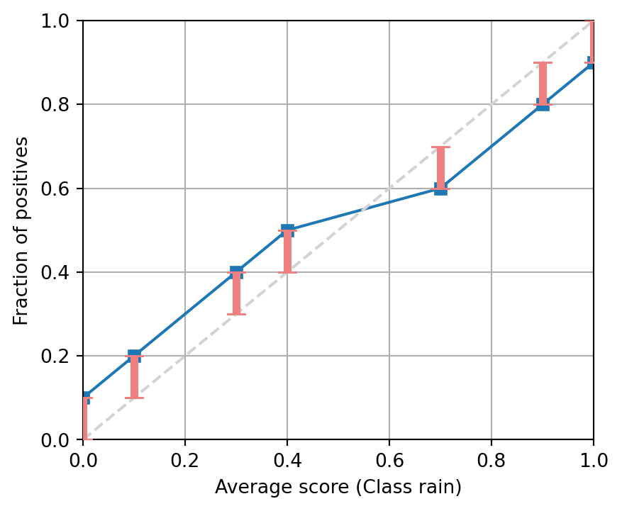 The degree of calibration is assessed using the gaps in the reliability diagram. All of this will be elaborated in the next part of the tutorial.