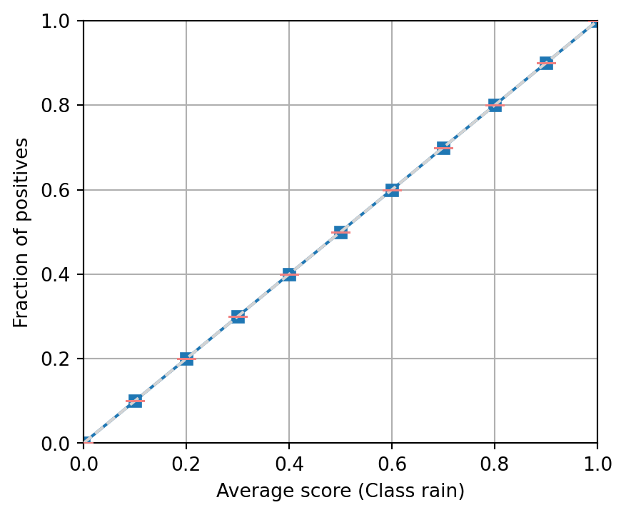 The evaluation of calibration requires a large number of samples to make a statement. However, in this toy example we can assume that a \(10\%\) discrepancy is acceptable, and that the number of samples is sufficient.